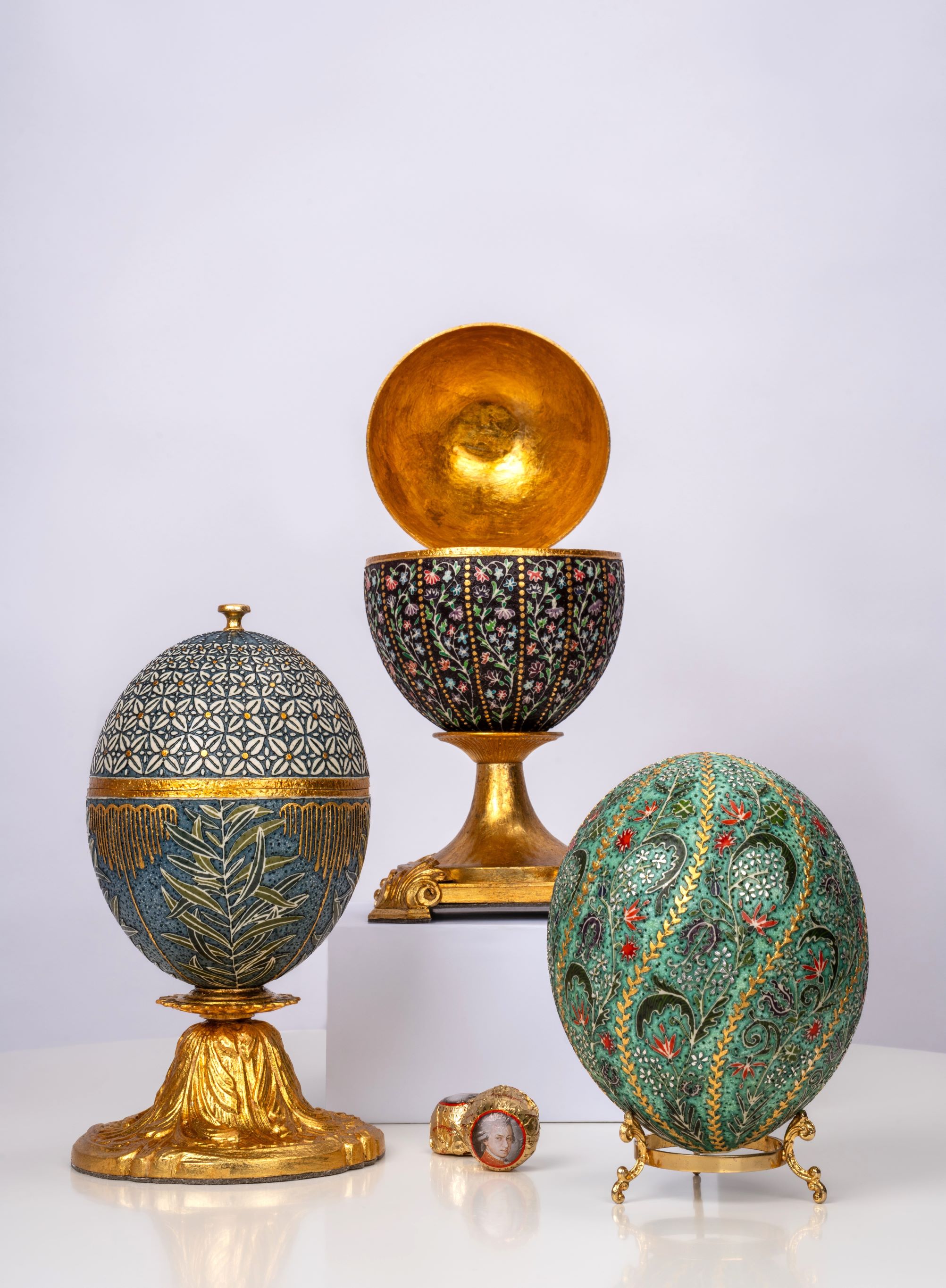 Astfel, am încercat să împletesc armonios pe superbe ovoide culori și flori; argint și aur. În tabloul din Renașterea italiană am regăsit două dintre culorile mele preferate – albastrul cerului cu o ușoară tente cenușie și turcoazul verzui din luciul apei, pe care le-am folosit ca fundal pentru cele două creații din ou de struț, așa cum se remarcă cu ușurință. Din superbele catrințe bănățene, am cules miresme și flori, le-am admirat și le-am reinterpretat.