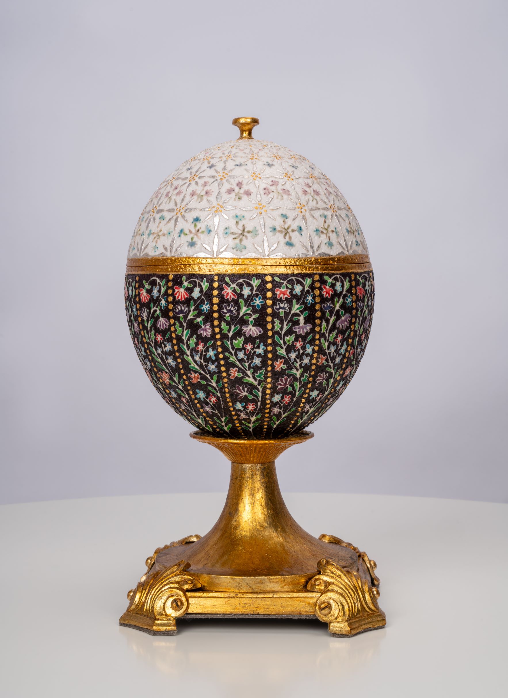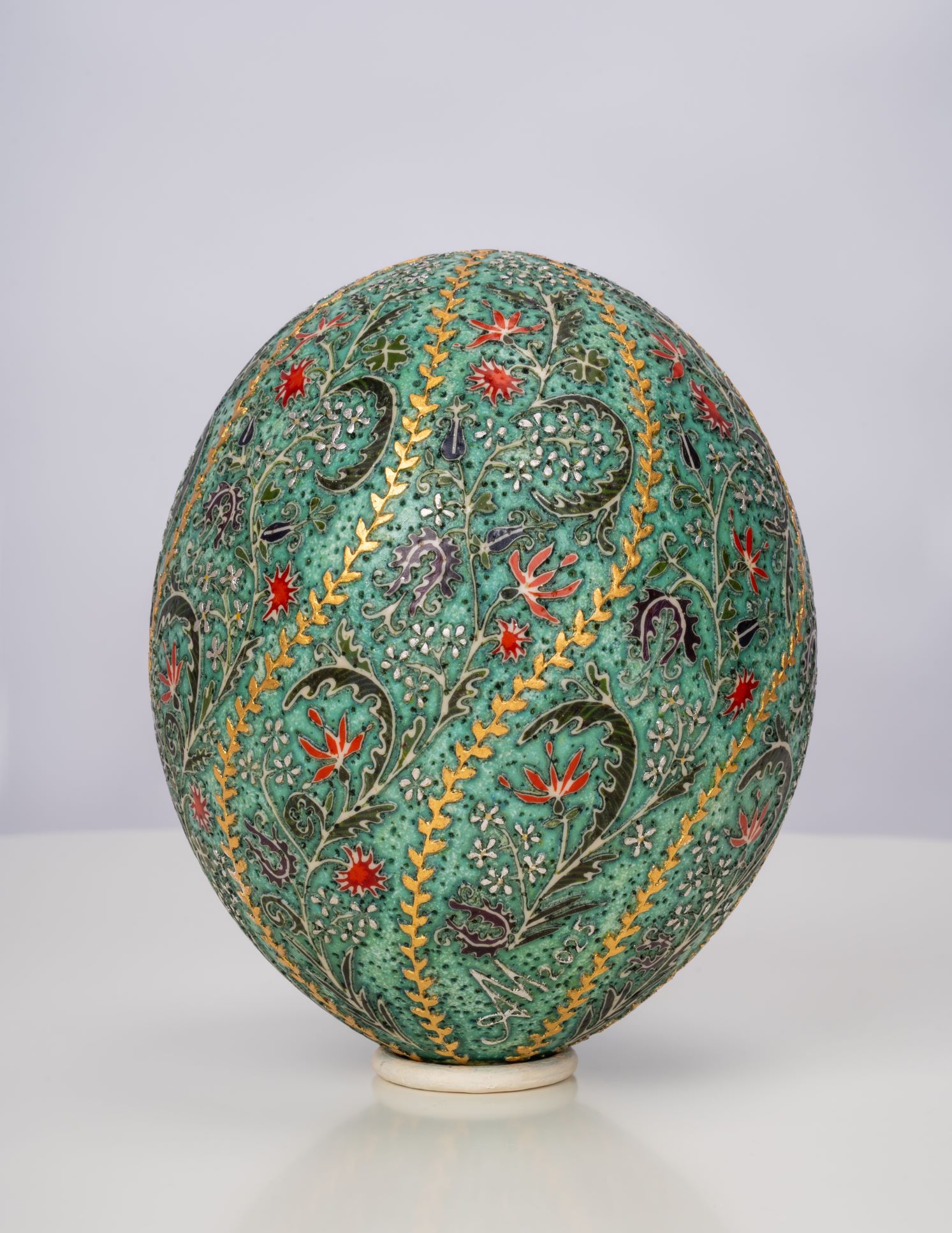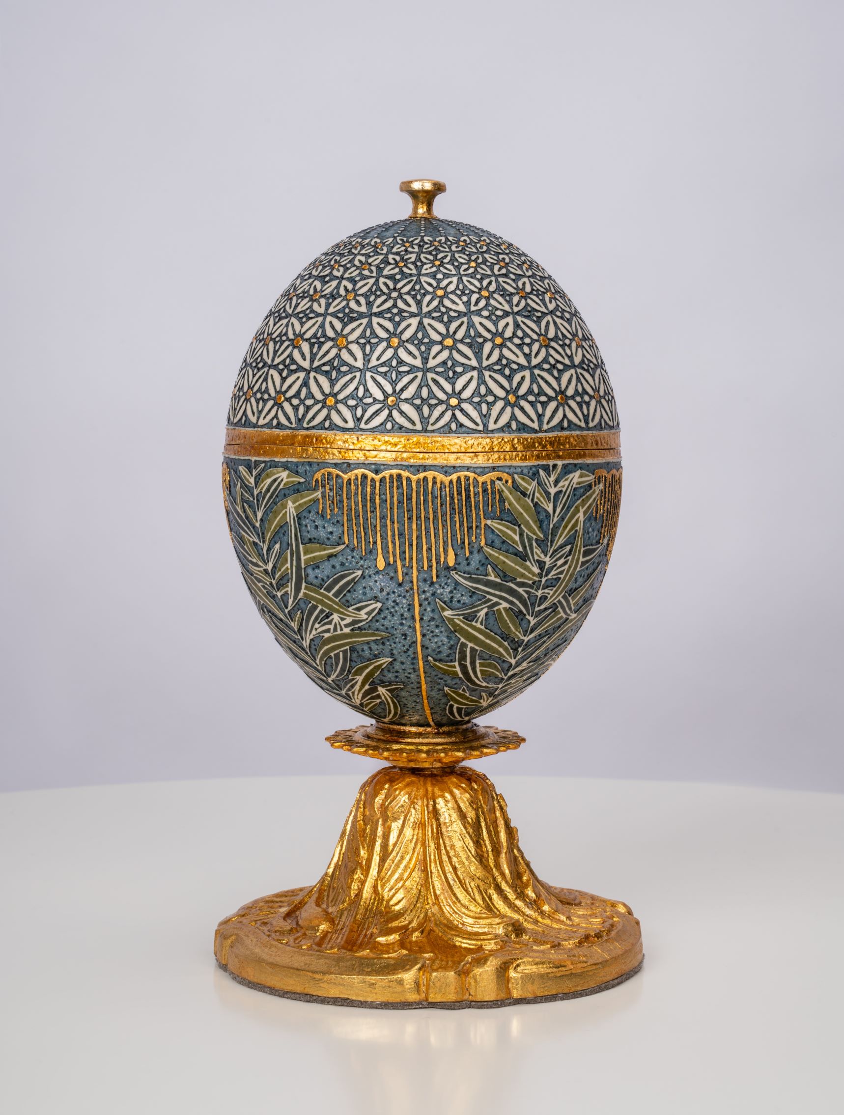 Și cum probabil ai remarcat deja, tot ceea ce creez are sens și semnificație pentru cunoscătorii din domeniu, iar motivele sunt alese cu rost pentru simbolismul lor profund. În felul acesta valoarea lucrărilor va spori și mai mult în timp, spunând povești unice despre frumusețea de altădată! Și dacă până acum îmi doream să surprind pe ovoid cât mai fidel decorul din sursa de inspirație, doar adaptând-ul la arta pe ou, de data aceasta mi-am lăsat frâu liber imaginației! Astfel, am încercat să împletesc armonios pe superbe ovoide culori și flori; argint și aur. În tabloul din Renașterea italiană am regăsit două dintre culorile mele preferate – albastrul cerului cu o ușoară tente cenușie și turcoazul verzui din luciul apei, pe care le-am folosit ca fundal pentru cele două creații din ou de struț, așa cum se remarcă cu ușurință. Din superbele catrințe bănățene, am cules miresme și flori, le-am admirat și le-am reinterpretat.