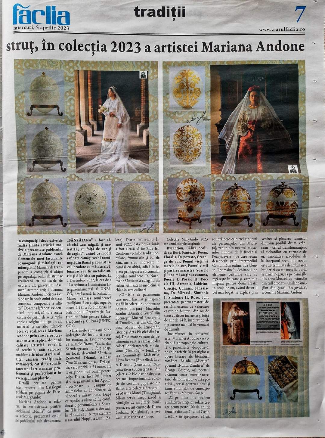 Colecția 2023 a artistei clujence Mariana Andone, prezentată de curând pe site-ul www.maryando.ro și în rețelele Facebook și Instagram, sub titlul ”Sânzâiana”, este alcătuită din lucrări unicat, toate invocând un autentic filon etnografic național. Mariana Andone uimește și de această dată publicul prin originale piese realizate cu desăvârșită măiestrie, după vechi broderii autohtone. Indiscutabil, lucrările sale impecabile – încrustări alb pe alb pe ouă de struț, ori migălos înnobilate cu foiță de aur de 24 de karate -, ne duc cu gândul la piese din colecții europene ale celebrului bijutier Peter Paul Fabergé (1846-1920).