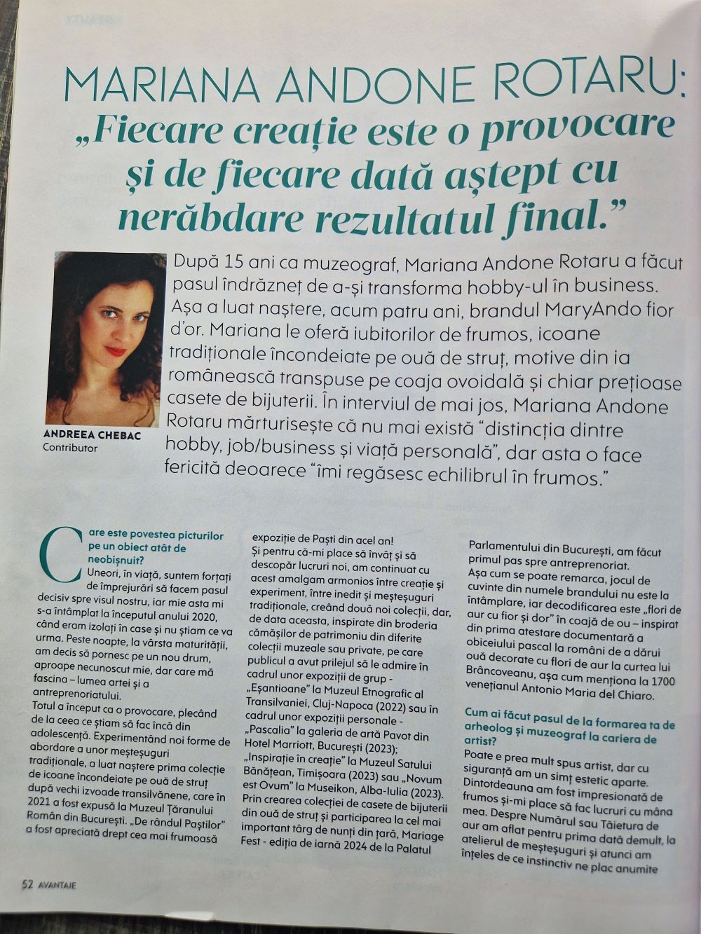 MARIANA ANDONE-ROTARU: ”Fiecare creație este o provocare și de fiecare dată aștept cu nerăbdare rezultatul final”. După 15 ani ca muzeograf, Mariana Andone-Rotaru a făcut pasul îndrăzneț de a-și transforma hobby-ul în business. Așa a luat naștere, acum patru ani, brandul MaryAndo fior d`or. Mariana le oferă iubitorilor de frumos, icoane tradițioanale încondeiate pe ouă de struț, motive din ia românească transpuse pe coaja ovoidală și chiar prețioase casete de bijuterii. În interviul de mai jos, Mariana Andone-Rotaru mărturisește că nu mai există ”distincția dintre hobby, job/business și viața personală”, dar asta o face fericită deoarece ”îmi regăsesc echilibrul în frumos”.